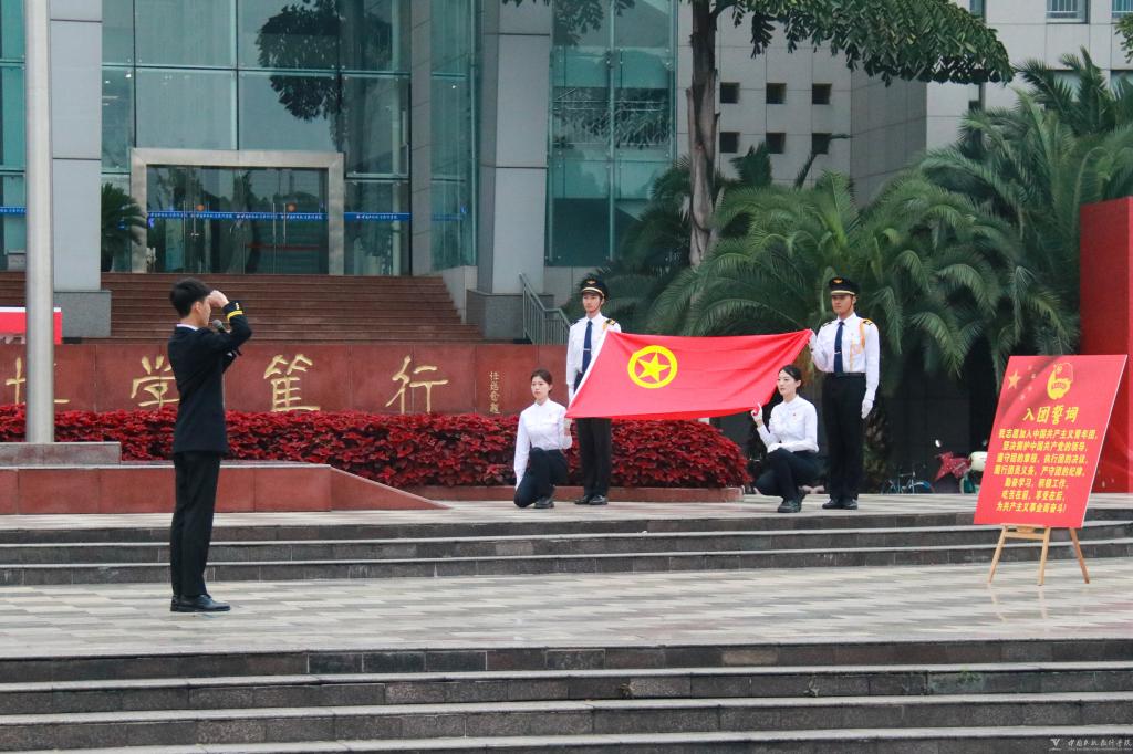 上午7时40分,伴随着国歌响起,五星红旗在全体师生的注目礼中冉冉升起。护旗队同学们步伐整齐,展现了民航学子坚定的信念与昂扬的斗志。嘹亮的《义勇军进行曲》激励着师生的爱国情怀,全场齐声高唱国歌,表达对祖国的深情与敬意。随后,由优秀团员代表陈佑霖领誓,新发展团员在团旗下庄严宣誓,全体团员重温入团誓词。