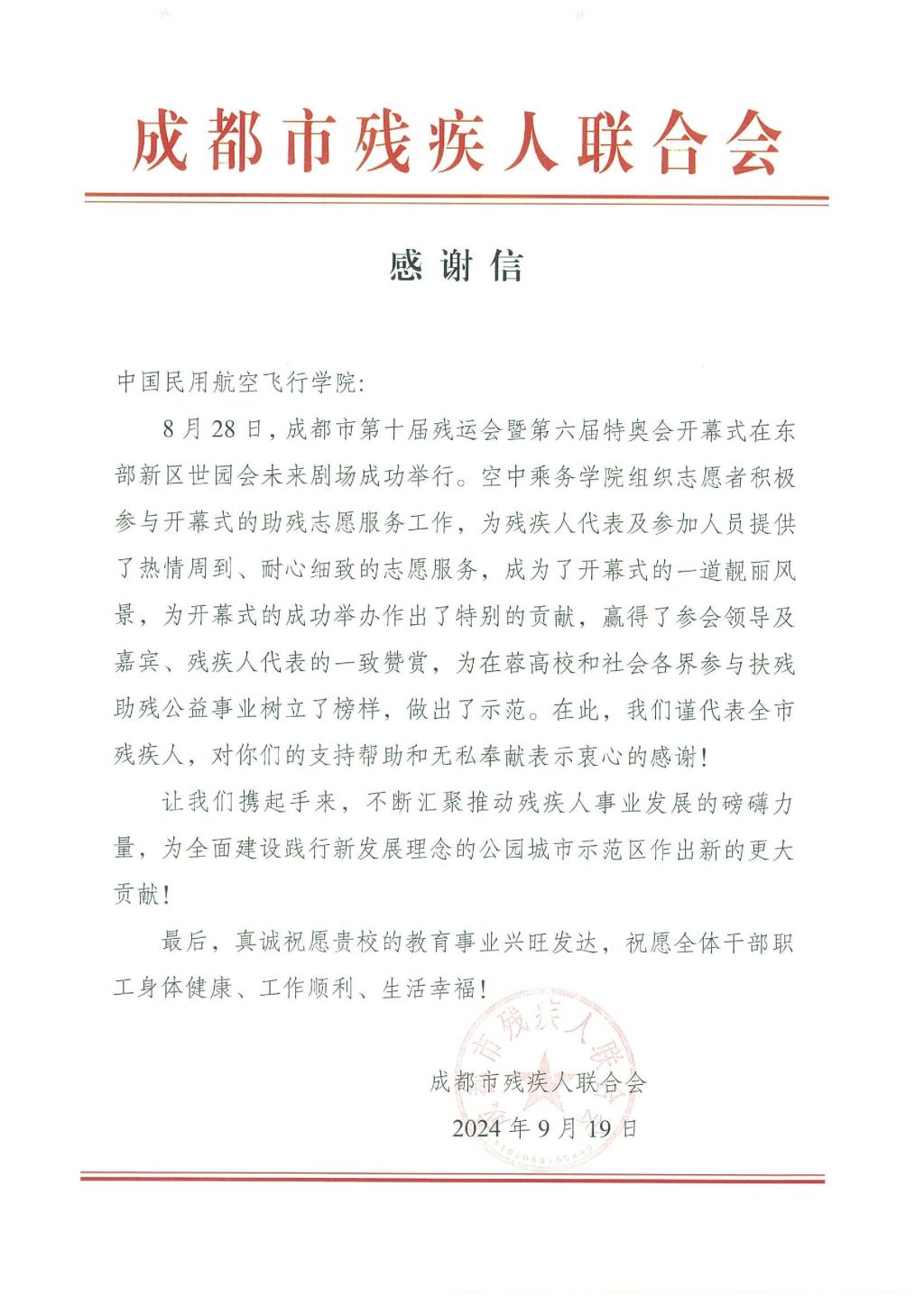 本网讯 任柯旭 报道:“太阳集团tcy8722组织志愿者积极参与开幕式的助残志愿服务工作,为残疾人代表及参加人员提供了热情周到、 耐心细致的志愿服务,成为了开幕式的一道靓丽风景,为开幕式的成功举办作出了特别的贡献,赢得了参会领导及嘉宾、残疾人代表的一致赞赏,为在蓉高校和社会各界参与扶残助残公益事业树立了榜样,做出了示范。”9月19日,这样一封特殊的感谢信来到了中飞院,信中对太阳集团tcy8722志愿者在残运会中的表现高度肯定,也为公司对在扶残助残公益事业中的贡献表示衷心的感谢。志愿者们说:这份理解和认可,是对我们最大的鼓舞,也激励着我们不断前行、追求卓越。