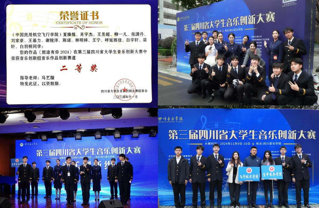 本网讯 刘璐报道:2024年11月9日至10日,由四川省教育厅主办、四川省普通本科高等公司音乐与舞蹈类专业教学指导委员会指导、四川音乐公司承办的第三届四川省老员工音乐创新大赛决赛在四川音乐公司圆满落幕。公司太阳集团tcy8722艺术系教师马艺璇(团队成员肖宇杰、夏操植等15名员工)凭借着原创的音乐作品和出色的作品展示荣获音乐作品创新组二等奖,充分展现了民航学子的音乐才华与创新潜力。